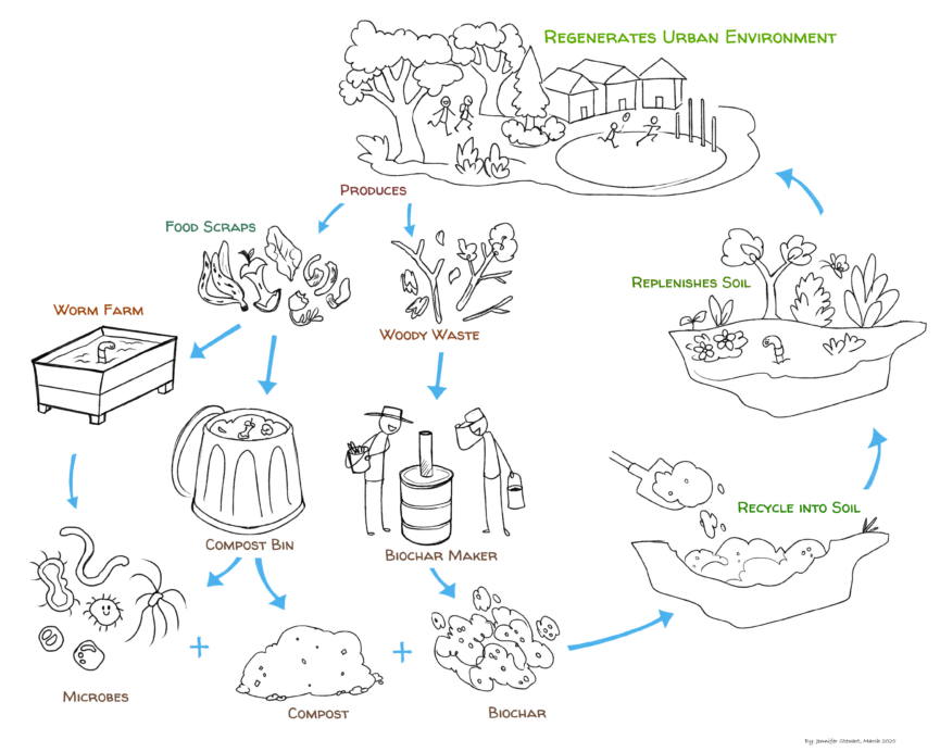 - Raise awareness of the benefits of transforming the city into a carbon sink with an integrated approach using biochar, compost and microbes.